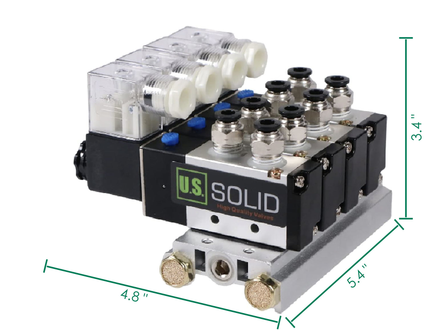 صمام الملف اللولبي الكهربائي الهوائي ذو الوضعين، المصنوع في الولايات المتحدة الأمريكية، ذو الخمسة اتجاهات، هو مفتاح لتوجيه الهواء إلى أي جهاز هوائي، عادةً ما يكون مُشغّلاً، مما يسمح بإشارة صغيرة نسبيًا للتحكم في جهاز كبير. وهو أيضًا حلقة الوصل بين وحدات التحكم الإلكترونية والأنظمة الهوائية. يتيح هذا الصمام التحكم الهوائي في الموضع والتدفق والضغط ودرجة الحرارة. هذا صمام 5/2، أي أنه يحتوي على خمسة منافذ: منفذا عادم لتنظيم تدفق الهواء، ومنفذا طاقة لتزويد النظام بالطاقة، ومنفذ إمداد واحد لمدخل ضغط الهواء، وموضعي تدفق. هذا الصمام مصنوع من سبيكة ألومنيوم.