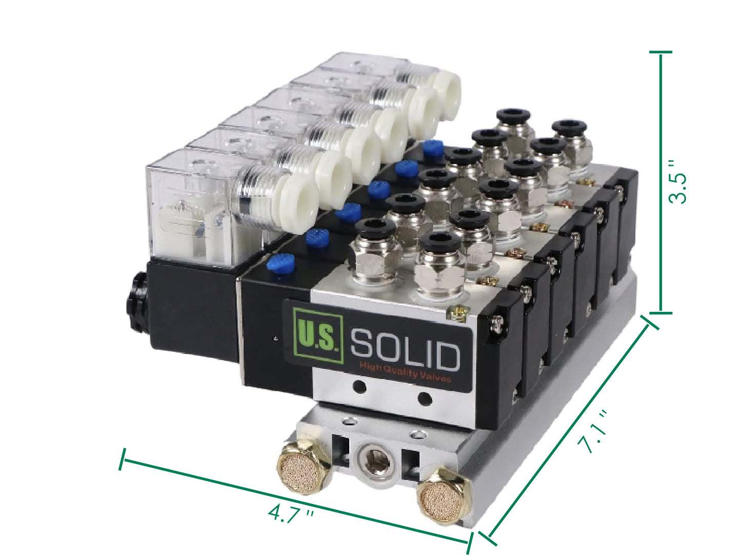 صمام الملف اللولبي الكهربائي الهوائي ذو الوضعين، المصنوع في الولايات المتحدة الأمريكية، ذو الخمسة اتجاهات، هو مفتاح لتوجيه الهواء إلى أي جهاز هوائي، عادةً ما يكون مُشغّلاً، مما يسمح بإشارة صغيرة نسبيًا للتحكم في جهاز كبير. وهو أيضًا حلقة الوصل بين وحدات التحكم الإلكترونية والأنظمة الهوائية. يتيح هذا الصمام التحكم الهوائي في الموضع والتدفق والضغط ودرجة الحرارة. هذا صمام 5/2، أي أنه يحتوي على خمسة منافذ: منفذا عادم لتنظيم تدفق الهواء، ومنفذا طاقة لتزويد النظام بالطاقة، ومنفذ إمداد واحد لمدخل ضغط الهواء، وموضعي تدفق. هذا الصمام مصنوع من سبيكة ألومنيوم.