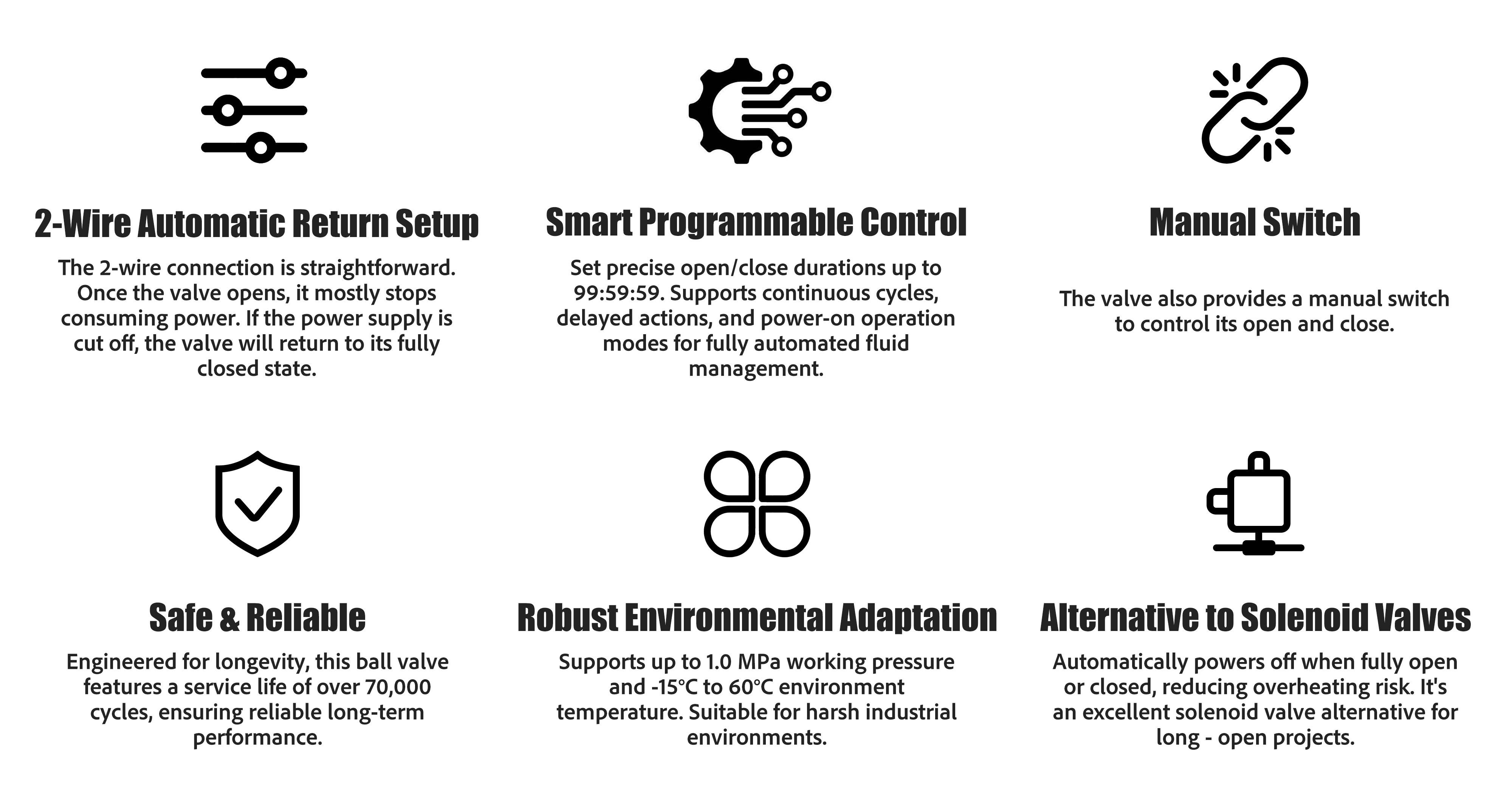 Dieses Zeitschaltuhr-Ablassventil der Serie ist eine industrietaugliche, vollautomatische Lösung zur Steuerung von Flüssigkeits- und Luftsystemen. Ausgestattet mit einem präzisen digitalen Timer ermöglicht es dem Benutzer, die Öffnungs- und Schließzeiten des Ventils von 00:00 bis 99:59:59 individuell anzupassen.
