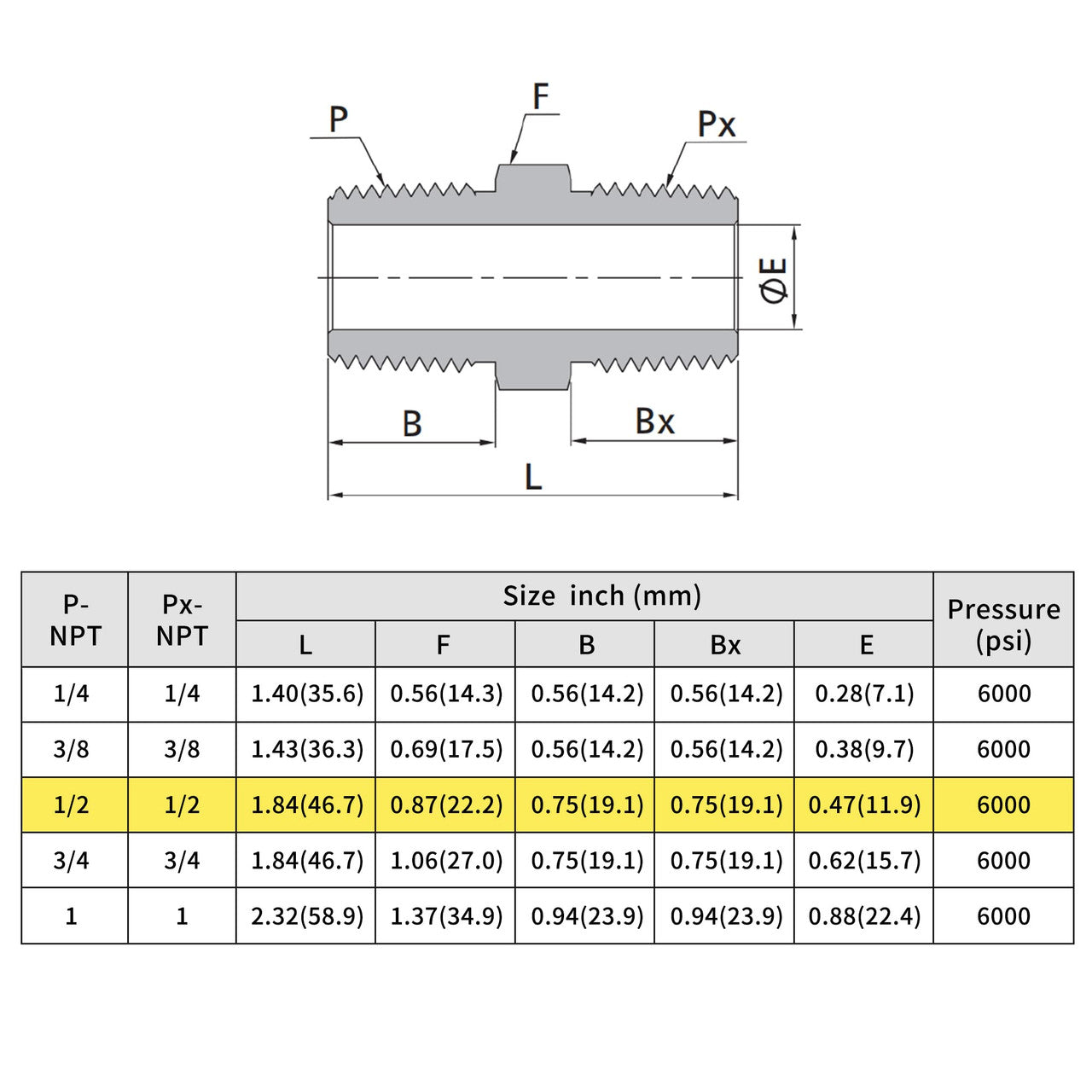 U.S. Solid 304 Edelstahl bleifrei 6000 psi Hochdruck-Sechskantnippel, 1/2" x 1/2" NPT Rohrverbinder mit Außengewinde (1 Stück)
