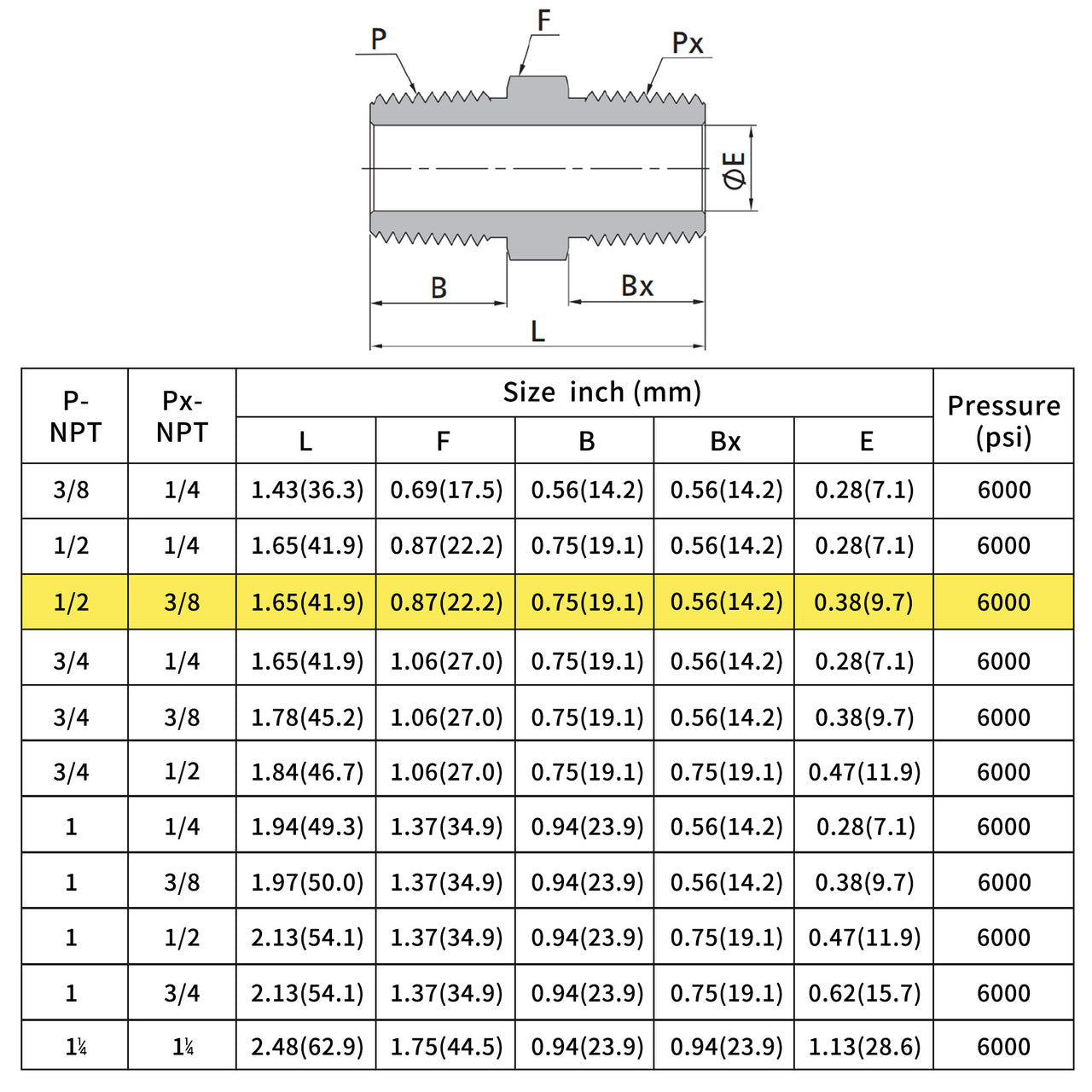 U.S. Solid 304 Edelstahl bleifrei 6000 psi Hochdruck-Sechskantnippel, 1/2" x 3/8" NPT Rohrverbinder mit Außengewinde (1 Stück)