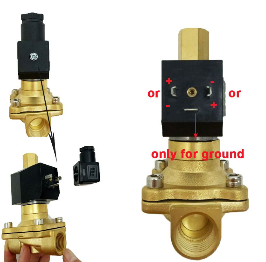 Bei Ventilen mit 2 Drähten betätigt das Ventil unabhängig davon, an welchen Anschluss jeder Draht angeschlossen ist (+ oder -). Einige Geräte, wie die links abgebildeten, verfügen über einen Erdungsdraht. Öffnen Sie den Stecker und suchen Sie nach dem Erdungssymbol in der Ecke der Abbildung. Bei Ventilen mit Erdungsdraht muss das Ventil unbedingt geerdet werden. Bei den anderen beiden Drähten betätigt das Ventil unabhängig davon, an welchen Anschluss jeder Draht angeschlossen ist (+ oder -).