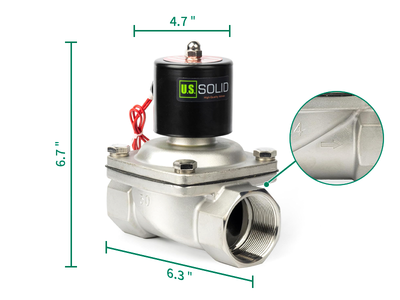 La flecha en la válvula indica la dirección del flujo. La mayoría de las válvulas US Solid son unidireccionales, lo que significa que están diseñadas para funcionar correctamente solo cuando el fluido fluye en la dirección de la flecha. Si se instalan en la dirección opuesta, la válvula podría no funcionar correctamente (por ejemplo, una válvula normalmente cerrada podría no cerrarse).