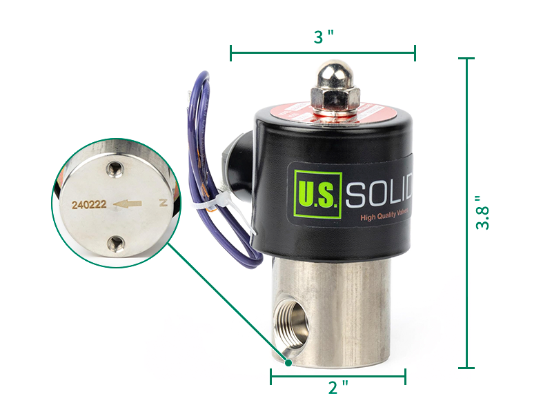 La flecha en la válvula indica la dirección del flujo. La mayoría de las válvulas US Solid son unidireccionales, lo que significa que están diseñadas para funcionar correctamente solo cuando el fluido fluye en la dirección de la flecha. Si se instalan en la dirección opuesta, la válvula podría no funcionar correctamente (por ejemplo, una válvula normalmente cerrada podría no cerrarse).