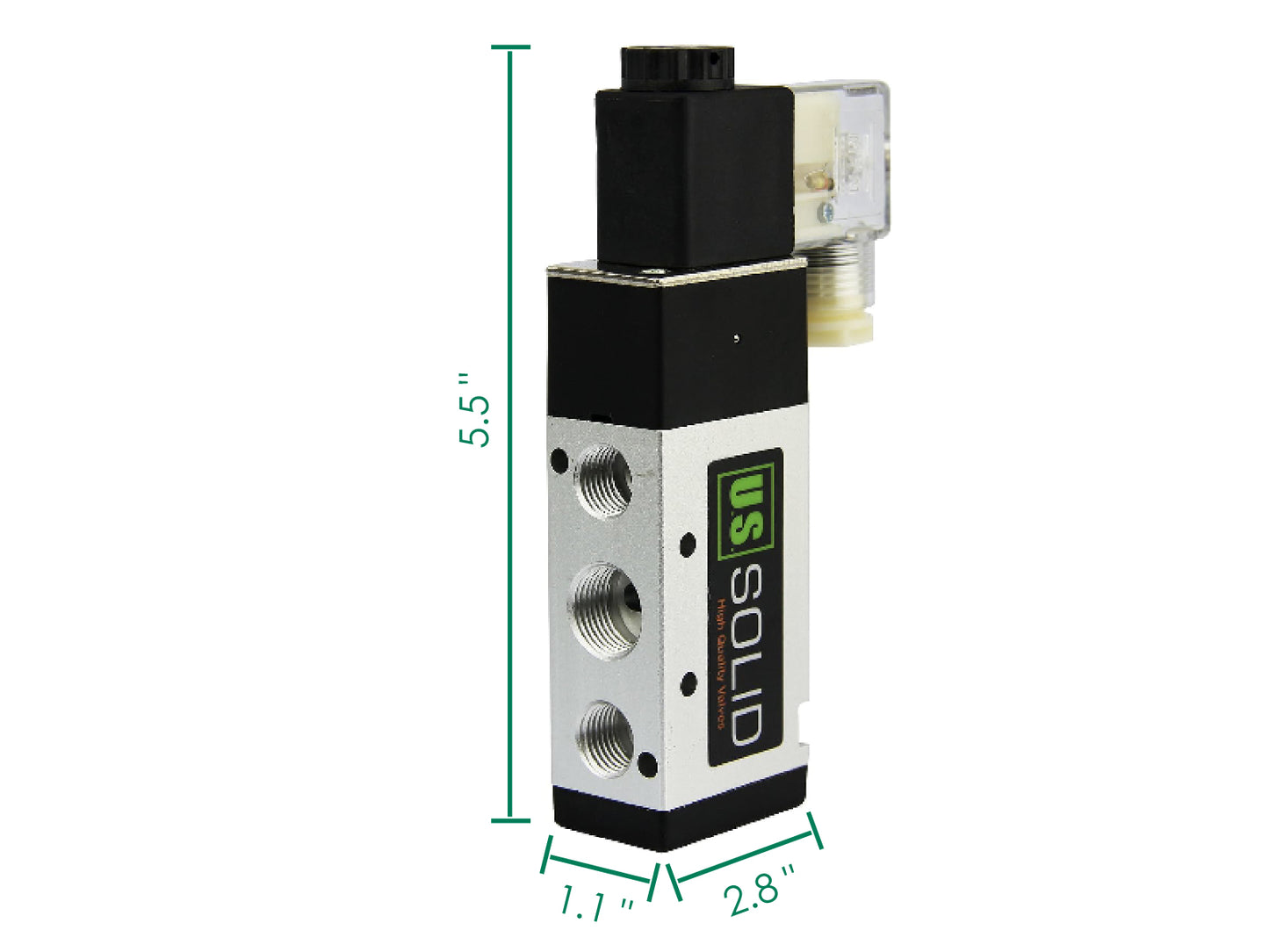 Esta electroválvula neumática estadounidense sólida de 5 vías y 2 posiciones es un interruptor que dirige el aire a cualquier dispositivo neumático, generalmente un actuador, permitiendo que una señal relativamente pequeña controle un dispositivo grande. También actúa como interfaz entre los controladores electrónicos y los sistemas neumáticos. Esta válvula permite el control neumático de la posición, el caudal, la presión y la temperatura. Es una válvula 5/2, lo que significa que cuenta con 5 puertos: 2 puertos de escape para regular el flujo de aire, 2 puertos de alimentación para alimentar el sistema, 1 puerto de suministro para la entrada de presión de aire y 2 posiciones de caudal. Esta válvula está fabricada con una aleación de aluminio. Los orificios de montaje son pasantes con unas dimensiones de 4,3 mm × 2.