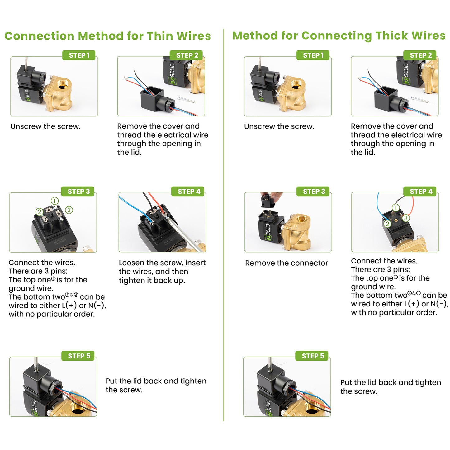 Kahdella johtimella varustettujen venttiilien kanssa on tärkeää huomata niiden napaisuus – tunteeton rakenne. Tämä tarkoittaa, että venttiili toimii oikein riippumatta siitä, mihin napaan kukin johdin on kytketty. Onko johdin kytketty positiiviseen (+) vai negatiiviseen (-) napaan, ei ole merkitystä venttiilin toiminnassa. On kuitenkin tärkeää tietää, että joissakin venttiiliyksiköissä on ylimääräinen maadoitusjohto. Jotta voit selvittää, onko venttiilissäsi maadoitusjohto, sinun on avattava liitin. Maadoitusjohdolla varustettujen venttiilien kohdalla asianmukainen maadoitus on ratkaisevan tärkeää.