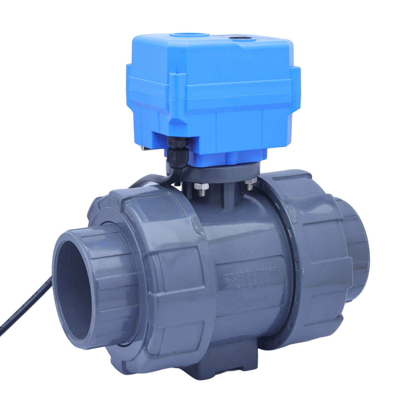 Sähkökäyttöisten UPVC-palloventtiilien sarjaamme on päivitetty kolme suurempaa kokoa: 1-1/4", 1-1/2" ja 2". Näissä suuremmissa venttiileissä on ainutlaatuinen kaksoisliitos, joka helpottaa asennusta ja huoltoa. Putkiliittimet on valmistettu Yhdysvaltain standardin mukaisesti ja niissä käytetään yksinkertaista liuotinsementtiliitosta, toisin kuin kierteitetyt NPT- tai G-liitokset. Muiden liitäntästandardien osalta ota yhteyttä asiakaspalveluumme.