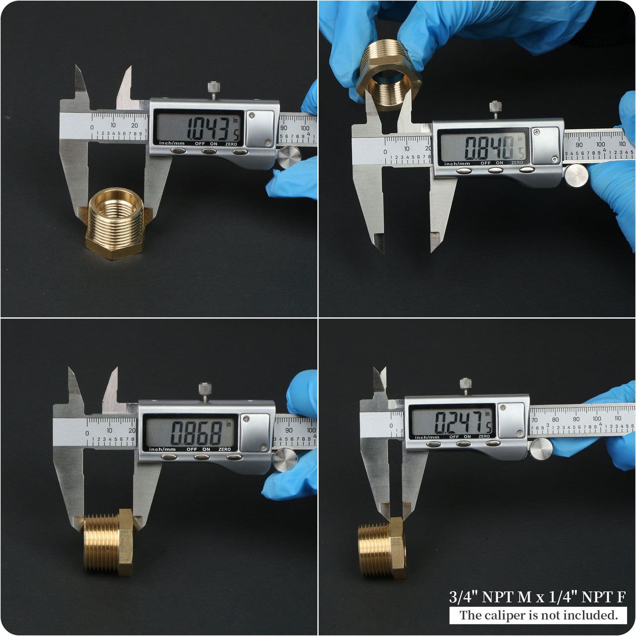 Tämä 3/4" NPT Uros x 1/4" NPT Naaraspuolinen messinkinen kuusioholkki yhdistää kaksi eri halkaisijan omaavaa putkea. Toinen putki on uroskierteillä ja toinen naaraspuolisella kierteellä. Naaraspuolisen putken halkaisija on suurempi kuin uroskierteellä varustetun putken. Materiaali - U.S. Solid kuusioholkki on valmistettu messingistä, mikä tekee siitä kestävän ja korroosionkestävän. Messinkipinnassa voi olla pieniä vikoja varastoinnin tai kuljetuksen seurauksena. Nämä ovat normaaleja eivätkä vaikuta toimintaan. Huomautus - Tämä tuote sisältää kaksi 3/4" NPT Uros x 1/4" NPT Naaraspuolista messinkistä kuusioholkkia.NPT, kansalliset putkikierteiden standardit, ei ole todellinen halkaisija, vaan putken nimelliskoko. Sen koko nimi on American National Standard Pipe Thread standards, jota käytetään Yhdysvaltojen kansallisissa teknisissä standardeissa kierteitettyjen putkien ja putkiliittimien kierteille.