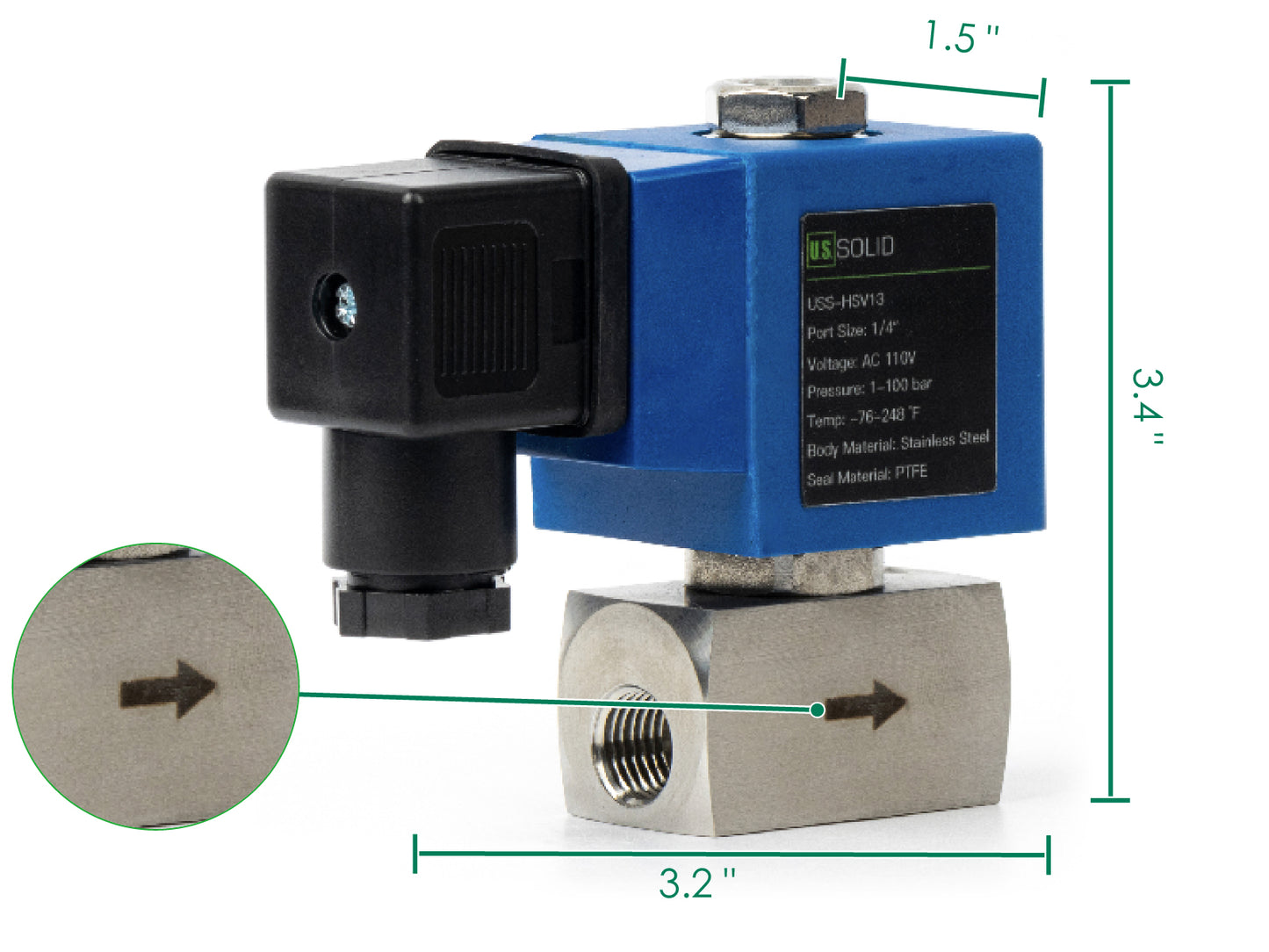 La freccia sulla valvola indica la direzione del flusso. La maggior parte delle valvole U.S. Solid sono unidirezionali, il che significa che sono progettate per funzionare correttamente solo quando il fluido scorre nella direzione indicata dalla freccia. Se installata nella direzione opposta, la valvola potrebbe non funzionare correttamente (ad esempio, una valvola normalmente chiusa potrebbe non chiudersi).