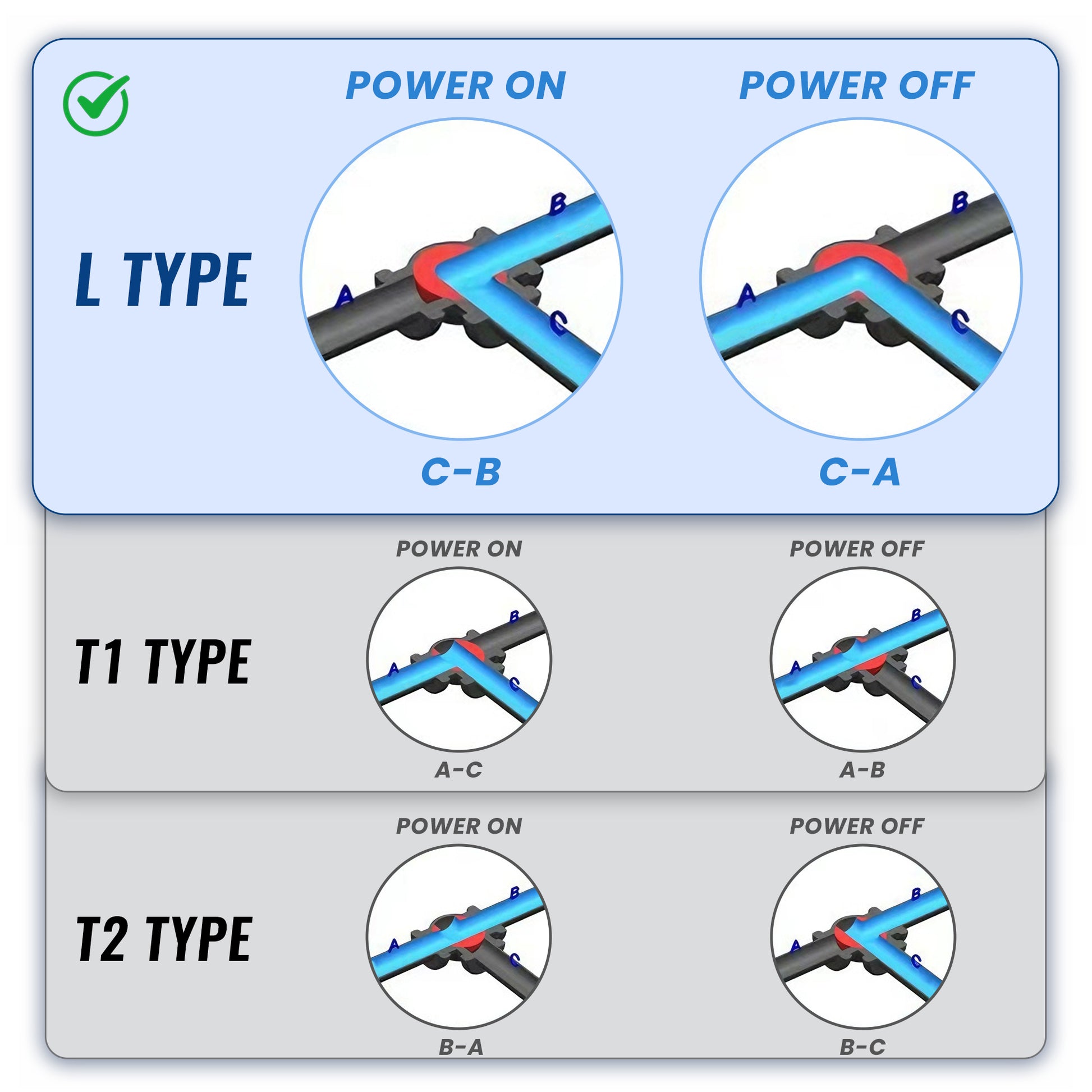 Questa serie di valvole a 3 vie offre configurazioni di tipo L e di tipo T (2 opzioni per il tipo T: T1/T2). Si prega di notare la differenza al momento dell'acquisto (fare riferimento alle immagini principali per i dettagli sul tipo di percorso del flusso).