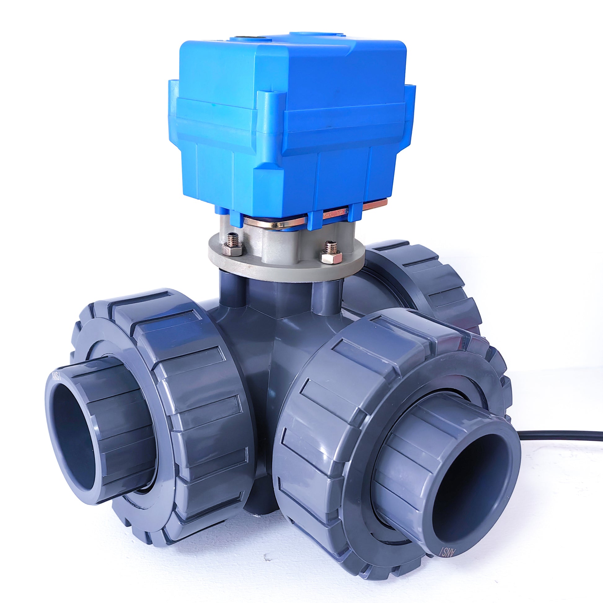 This UPVC 3-way motorized ball valve provides an alternative solution to our standard brass/stainless steel threaded ball valves currently available. Distinguished from NPT/G threaded connections, it adopts American standard socket end & union connection, which balances stable sealing performance with the convenience of quick disassembly and maintenance.