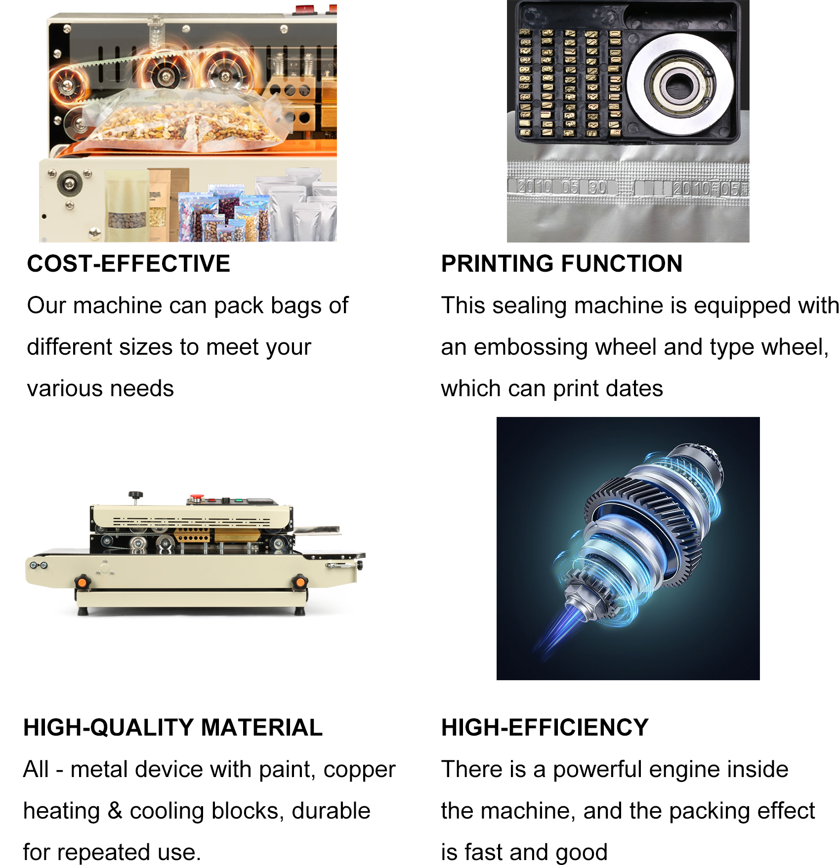 다양한 백 두께에 맞춰 완벽한 밀봉을 제공하는 조절식 백 공급 플레이트를 갖춘 올인원 연속 실링기로 포장 효율을 높여보세요. 12mm의 밀봉 폭을 제공하며, 0~12m/min의 속도로 작동하고, 0~300°C(572°F)의 온도 범위에서 최대 0.08mm 두께의 단층 백을 밀봉할 수 있습니다.