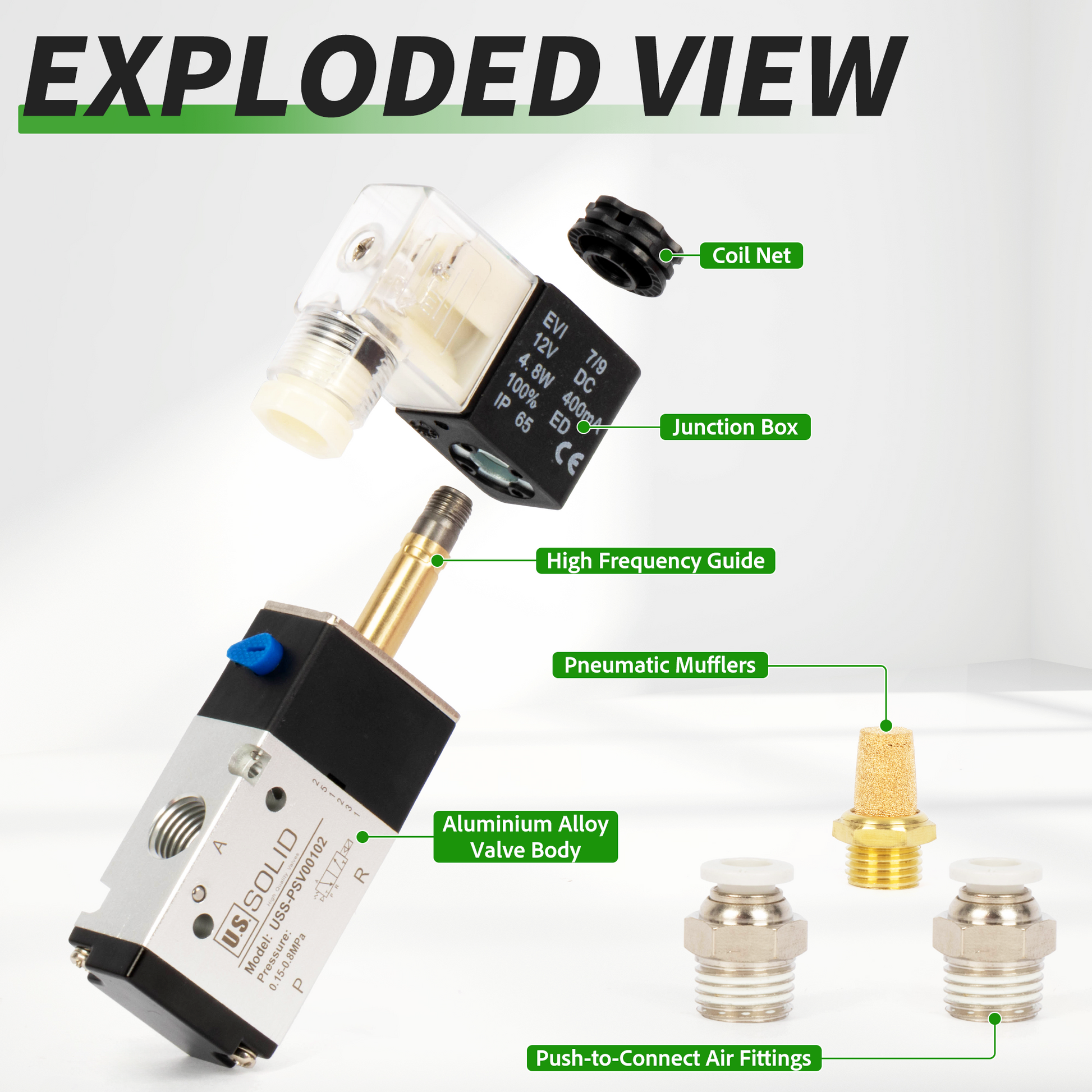 이 U.S. Solid 3방향 2위치 공압 전기 솔레노이드 밸브는 일반적으로 액추에이터와 같은 모든 공압 장치로 공기를 보내는 스위치로, 비교적 작은 신호로 큰 장치를 제어할 수 있습니다. 또한 전자 컨트롤러와 공압 시스템 간의 인터페이스 역할을 합니다. 이 밸브는 위치, 유량, 압력 및 온도를 공압으로 제어할 수 있습니다. 3/2 밸브는 3개의 포트(배기 포트 1개, 흡입 포트 1개, 액추에이터로 공기를 보내는 벤트 포트 1개)를 갖추고 있습니다. 이 밸브는 알루미늄 합금으로 제작되었습니다. 또한 이 공압 솔레노이드 밸브용 소음기, 피팅 및 10m 길이의 PTFE 테이프를 제공합니다.