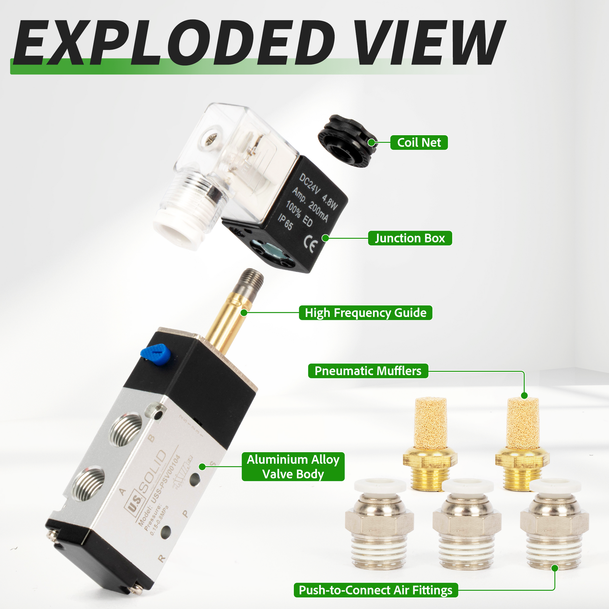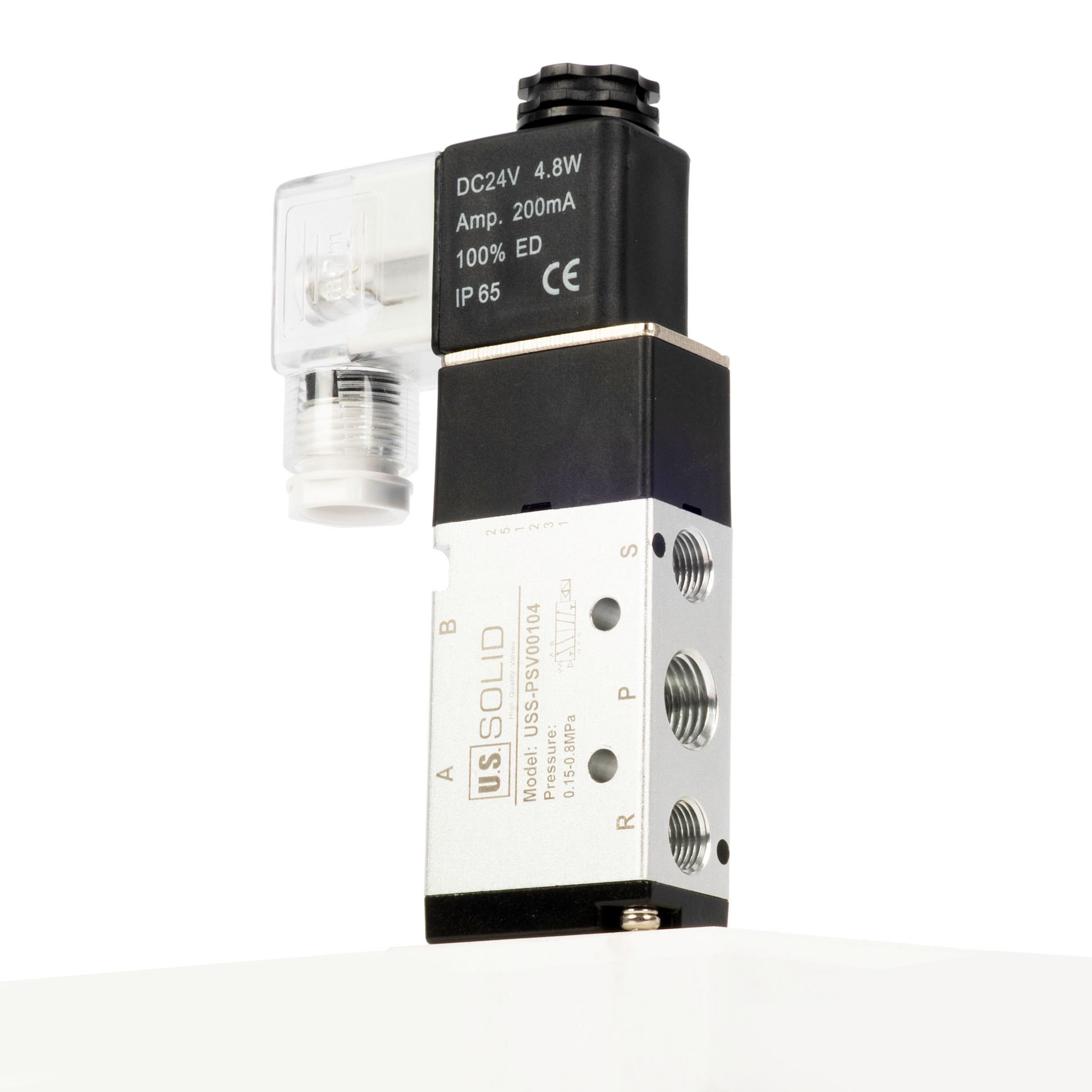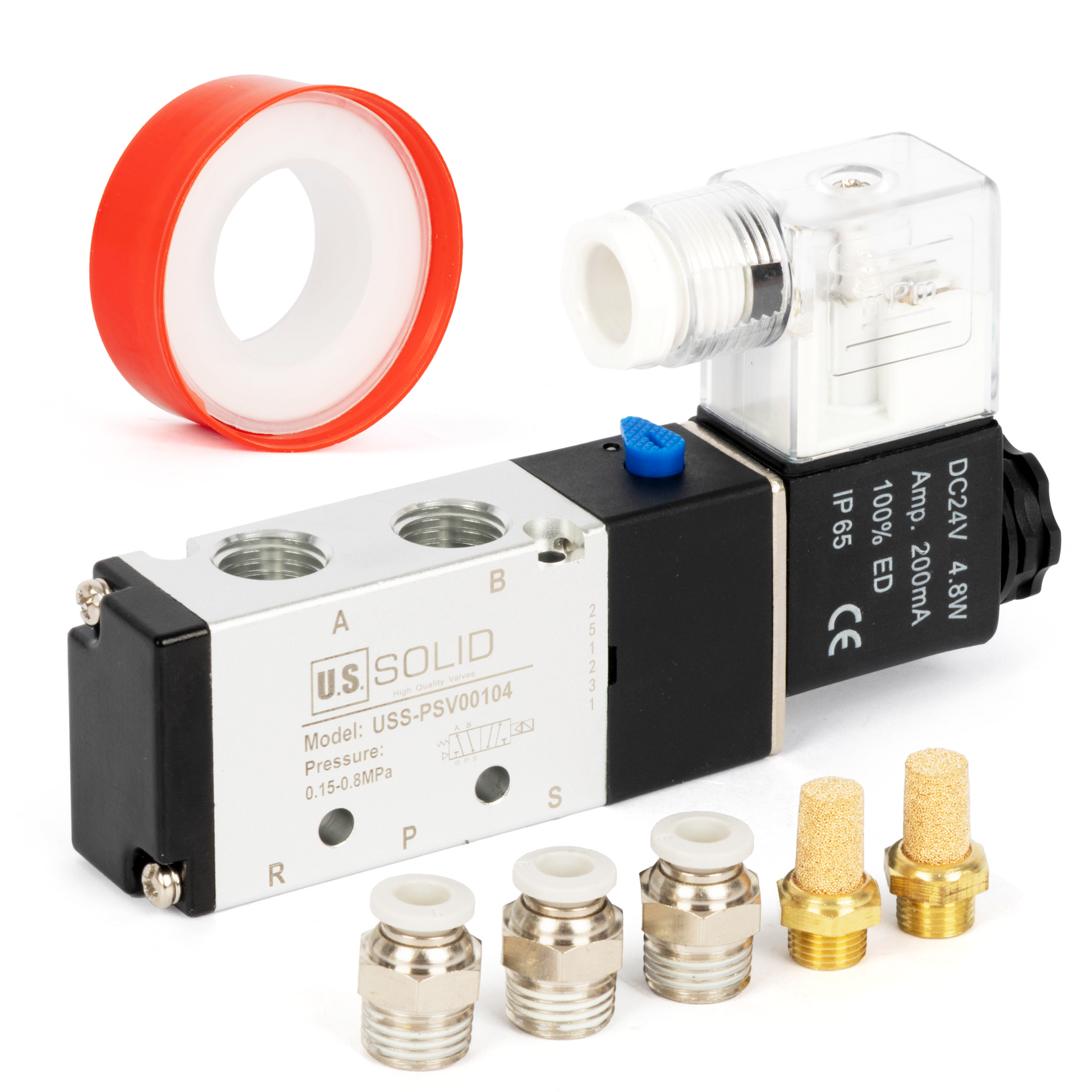 이 U.S. Solid 5방향 2위치 공압 전기 솔레노이드 밸브는 일반적으로 액추에이터와 같은 모든 공압 장치로 공기를 보내는 스위치로, 비교적 작은 신호로 큰 장치를 제어할 수 있습니다. 또한 전자 컨트롤러와 공압 시스템 간의 인터페이스 역할을 합니다. 이 밸브는 위치, 유량, 압력 및 온도를 공압으로 제어할 수 있습니다. 5/2 밸브는 5개의 포트(배기 포트 2개, 흡입 포트 1개, 액추에이터로 공기를 보내는 벤트 포트 2개)를 갖추고 있습니다. 이 밸브는 알루미늄 합금으로 제작되었습니다. 또한 이 공압 솔레노이드 밸브용 소음기, 피팅 및 10m 길이의 PTFE 테이프를 제공합니다.