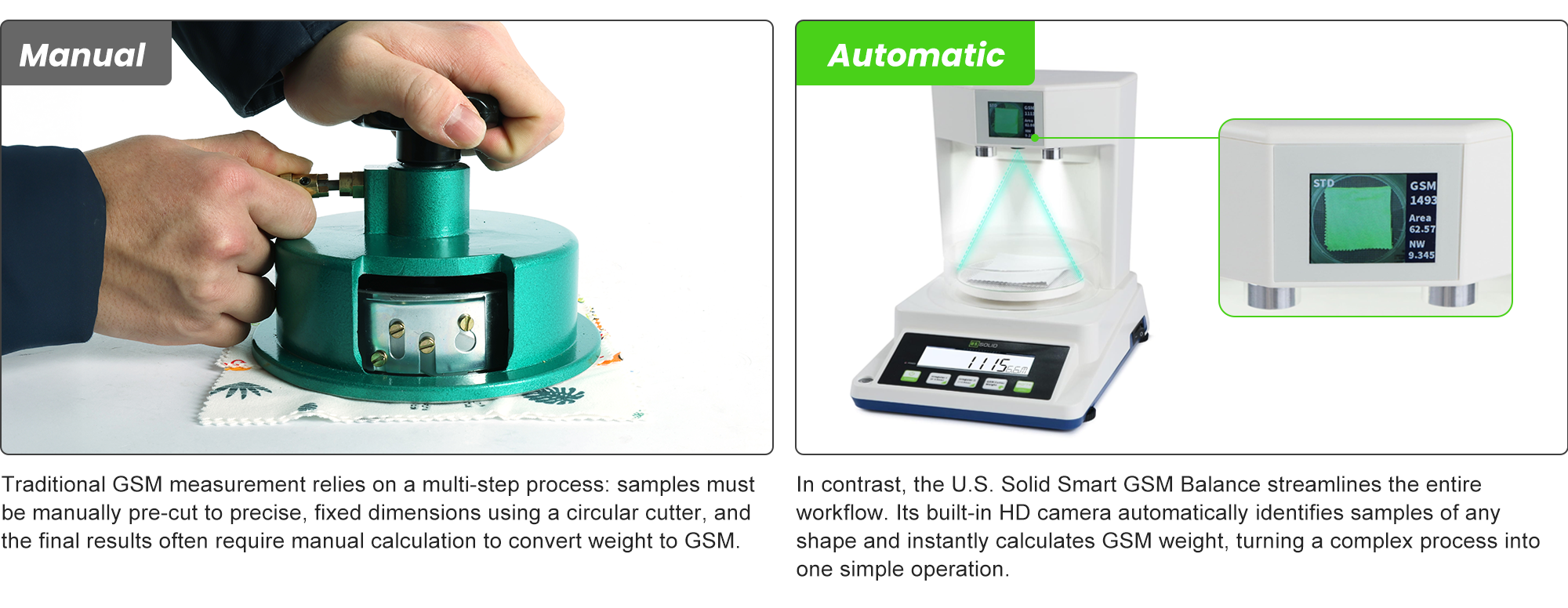 Imbangan GSM Pintar U.S. Solid menampilkan teknologi automasi canggih dengan kamera definisi tinggi terbina dalam yang secara automatik mengenal pasti kawasan sampel dan mengira berat GSM. Ini menghapuskan keperluan untuk pemotongan sampel manual dan memudahkan operasi dengan ketara.