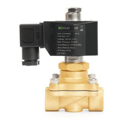 The U.S. Solid USS-YSV Series offers 2-way electric solenoid valves with both normally closed and normally open models, featuring semi-direct-acting functionality. These valves are available in 220/24 VAC and 24/12 VDC voltages and are constructed with industrial-grade brass or 304 stainless steel bodies and viton seal materials. Featuring a high-quality coil, this solenoid valve efficiently controls the opening and closing of the diaphragm in under 1 second for precise flow control. Suitable for various media types such as air, water, oil, natural gas, gasoline, diesel fuel, kerosene, and low viscosity fluids (less than 20 centistokes), this valve is designed for reliable performance.