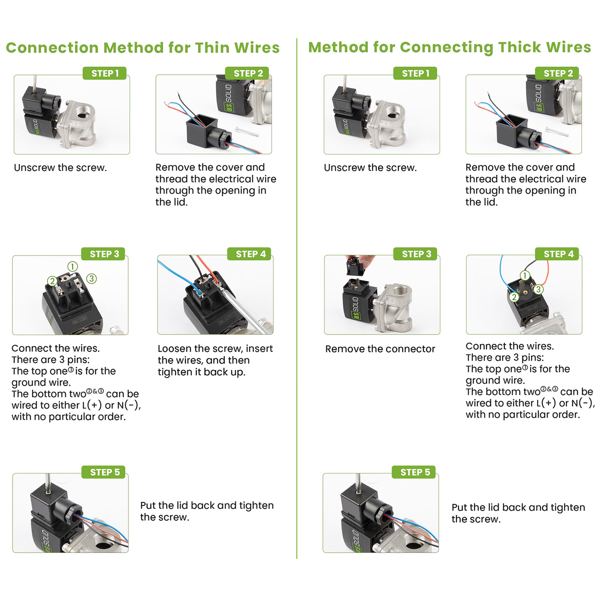 When dealing with valves equipped with two wires, an important characteristic to note is their polarity - insensitive design. This means that the valve will actuate correctly regardless of which terminal each wire is connected to. Whether a wire is attached to the positive (+) or negative (-) terminal makes no difference in the valve’s operation. However, it’s essential to be aware that some valve units incorporate an additional ground wire.To determine if your valve has a ground wire, you’ll need to open up the connector.For valves with a ground wire, proper grounding is crucial.