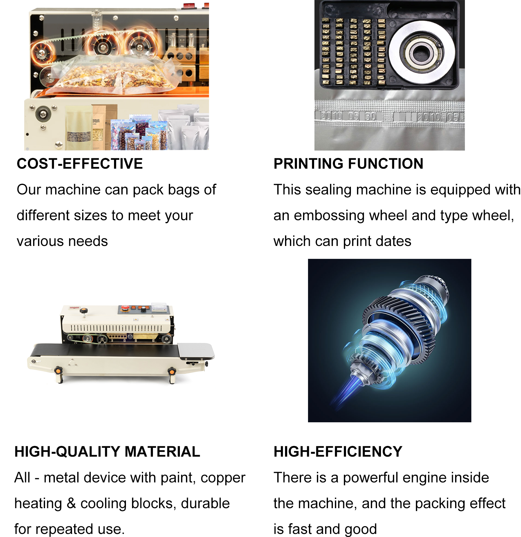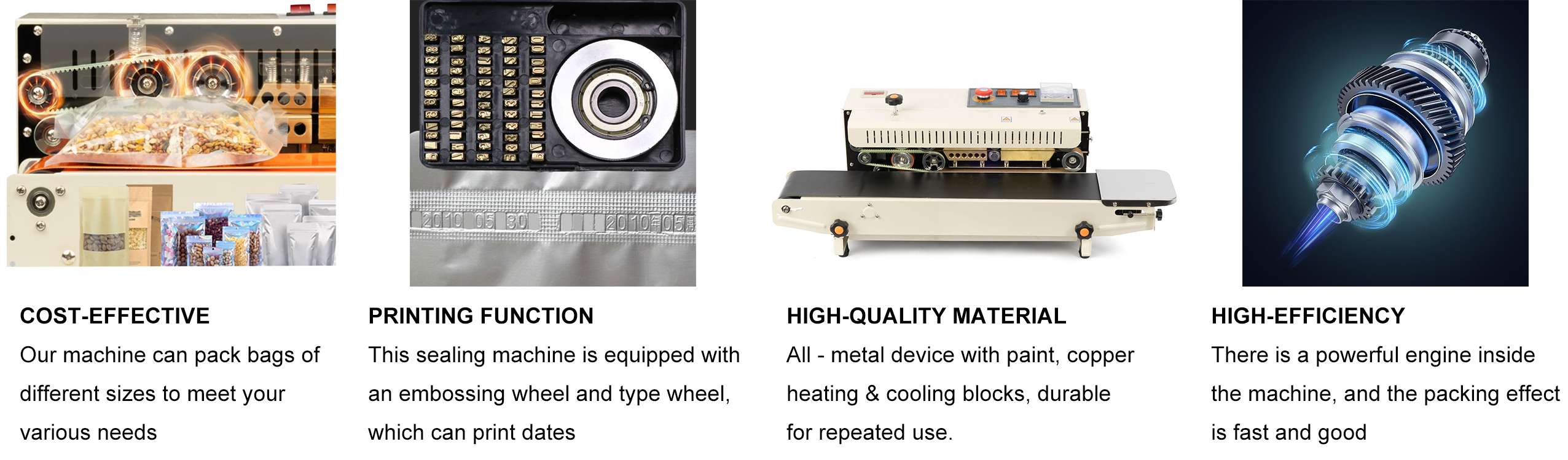 This continuous sealing machine combines excellent sealing performance, convenient printing function, space-saving design, and easy operation, making it an ideal choice for various business needs. In terms of specifications, it features a seal width of 0.4 inch, an adjustable speed range of 0-24m/min, and can seal single-layer bags with a maximum thickness of 0.18mm; its temperature is adjustable between 0-300℃ (572℉), and it can bear a load weight ranging from 0-3kg, adapting to different sealing requirements. Equipped with an embossing wheel and type wheel, it supports simultaneous printing of dates, comments, and logos while sealing, adding practical marking functions to your packaging process. Despite its powerful functionality, the machine adopts a compact horizontal automatic design, which is perfect for businesses with limited space; it is also built to be durable and long-lasting, capable of withstanding the rigors of continuous operation, ensuring stable performance in long-term use. Moreover, it has a uniquely designed user-friendly yet powerful control panel—you only need to turn on a few dials to start working, greatly reducing the difficulty of operation and improving work efficiency.
