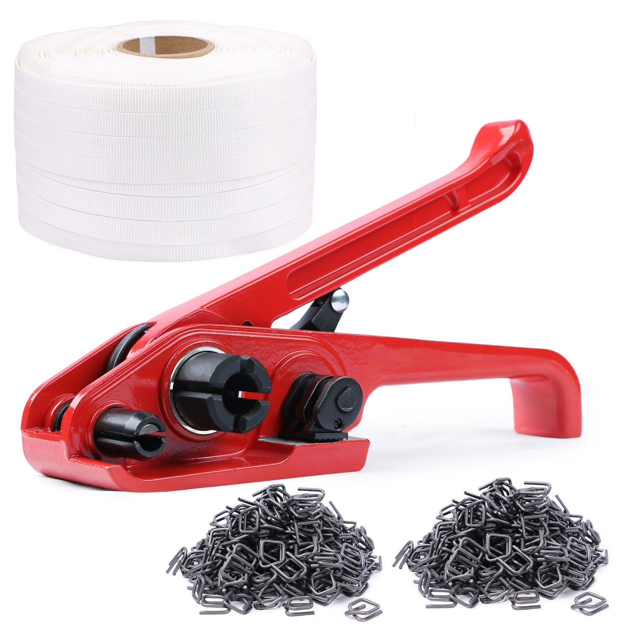 The tensioner is compatible with most strapping tools on the market, with a maximum strapping width of 0.75 inches. Made of durable and wear-resistant metal, it is specifically designed for easy portability. And, the strapping material used is a high-quality polyester composite banding with a width of 3/4" and a length of 985'. It has a tensile force of 3300 lbs and offers smooth operation and a touch that is gentle on hands. Unlike steel, it won't scratch, rust, or corrode.