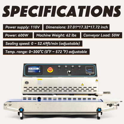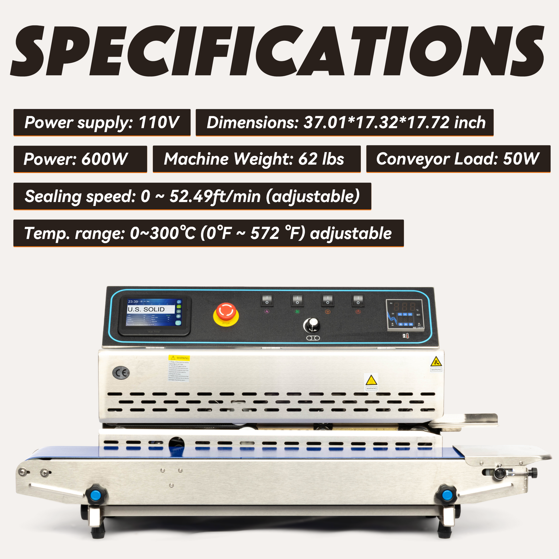 | Sealing Speed | 0 - 16M/min (adjustable) | Sealing Width | 0.39 inch |