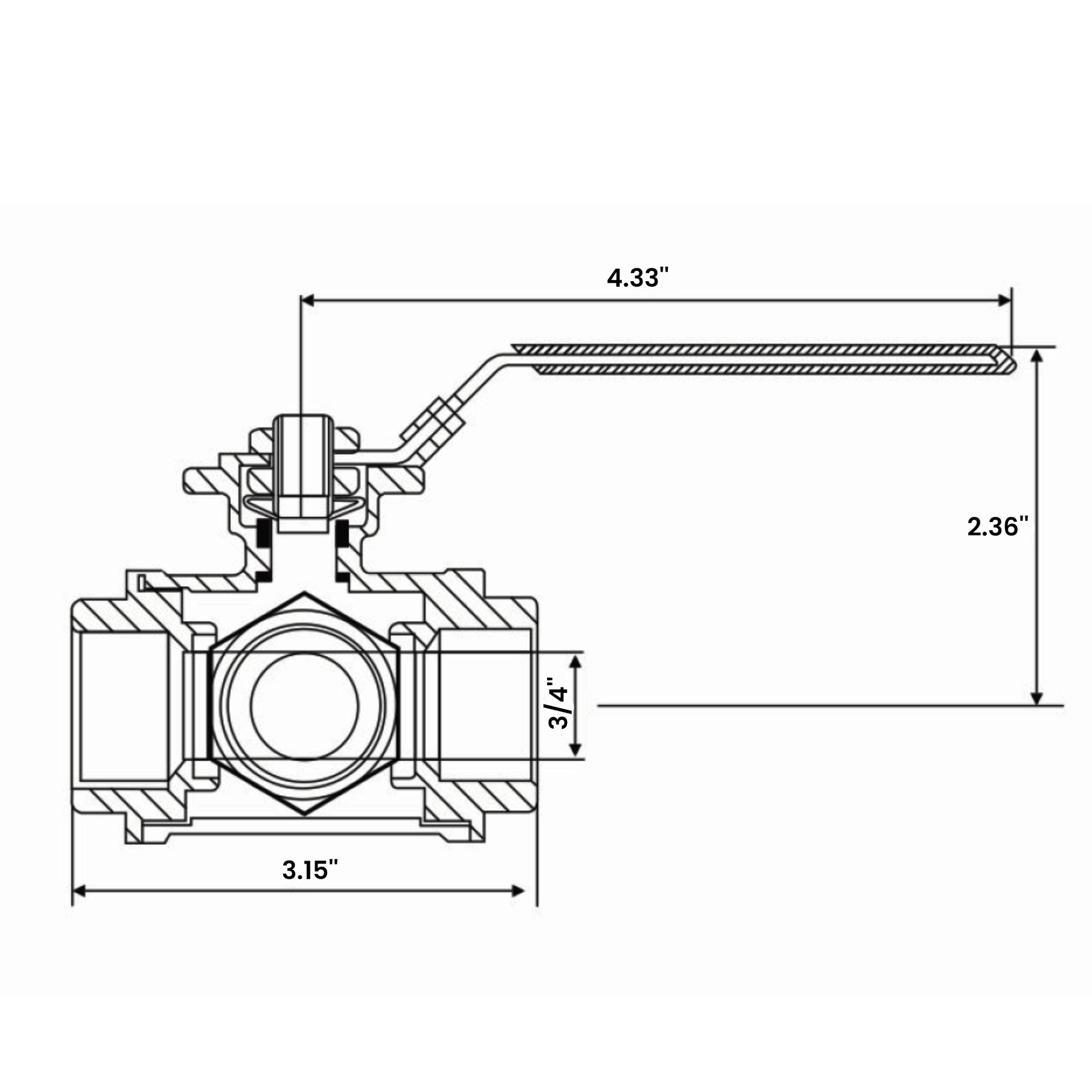 3/4" 三通球阀 - 304 不锈钢手动球阀,T 型安装垫